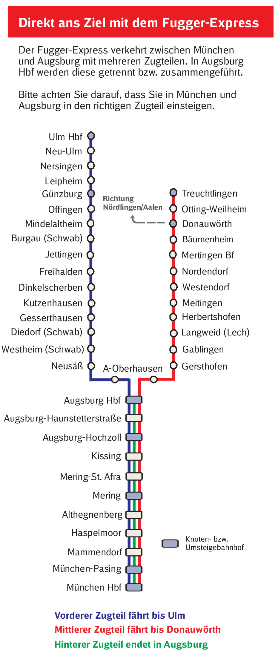Vom Bahnhof Mering kommen Sie mit dem Fugger-Express in 30 Minuten zur bayerischen Landeshauptstadt München oder in entgegengesetzter nördlicher Richtung zur Fuggerstadt Augsburg.