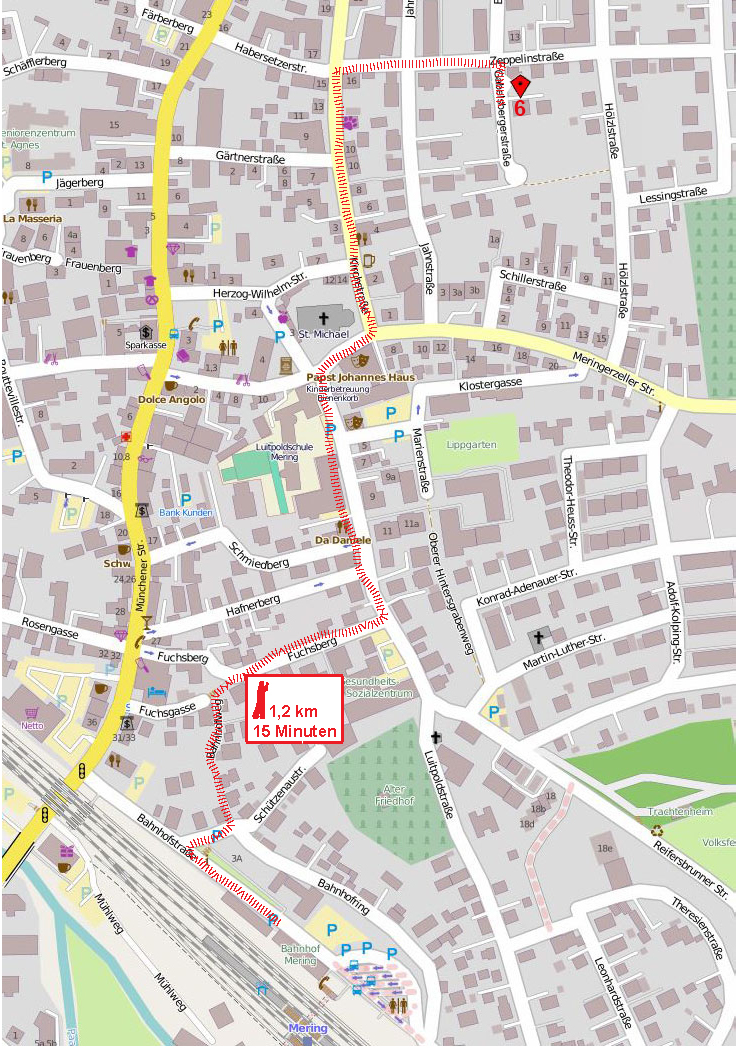 Den Bahnhof Mering liegt 1,2 km entfernt und ist zu Fuß in ca. 15 Minuten erreichbar.